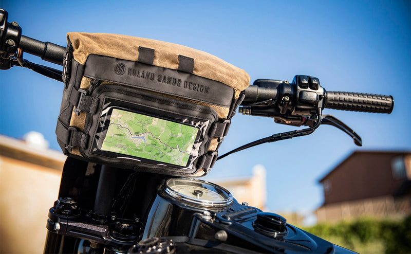 The Roland Sands Design X Kriega Roam Handlebar Bag is ideally suited for cruiser bikes with drag bar or t-bars with high risers, whilst the Velcro® Molle mounting system also enables a variety of other mounting options. Constructed from RSD’s propriety wax cotton together with 1000D Cordura® and super tough hypalon reinforcement to give a classic look with a modern technical twist. The main compartment is a roll-top waterproof Drypack, ideal for storing keep dry essentials. A quick access front pocket with dividers and key clip, keep small items to hand. An optional smartphone pocket can be mounted landscape or portrait for navigation with a touch-sensitive TPR screen cover or reverse mounted for easy access phone storage. Available in 2 colour options: Black or Ranger.